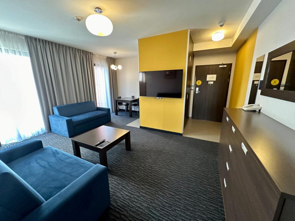 The price of accomodation includes: entrance to Wellness&GYM area (swimming pool, jacuzzi, dry and steam sauna, a small pool for kids and gym). Our parking is 24/7 monitored and it’s extra costs – 80 PLN/per night. The car park is not guarded.